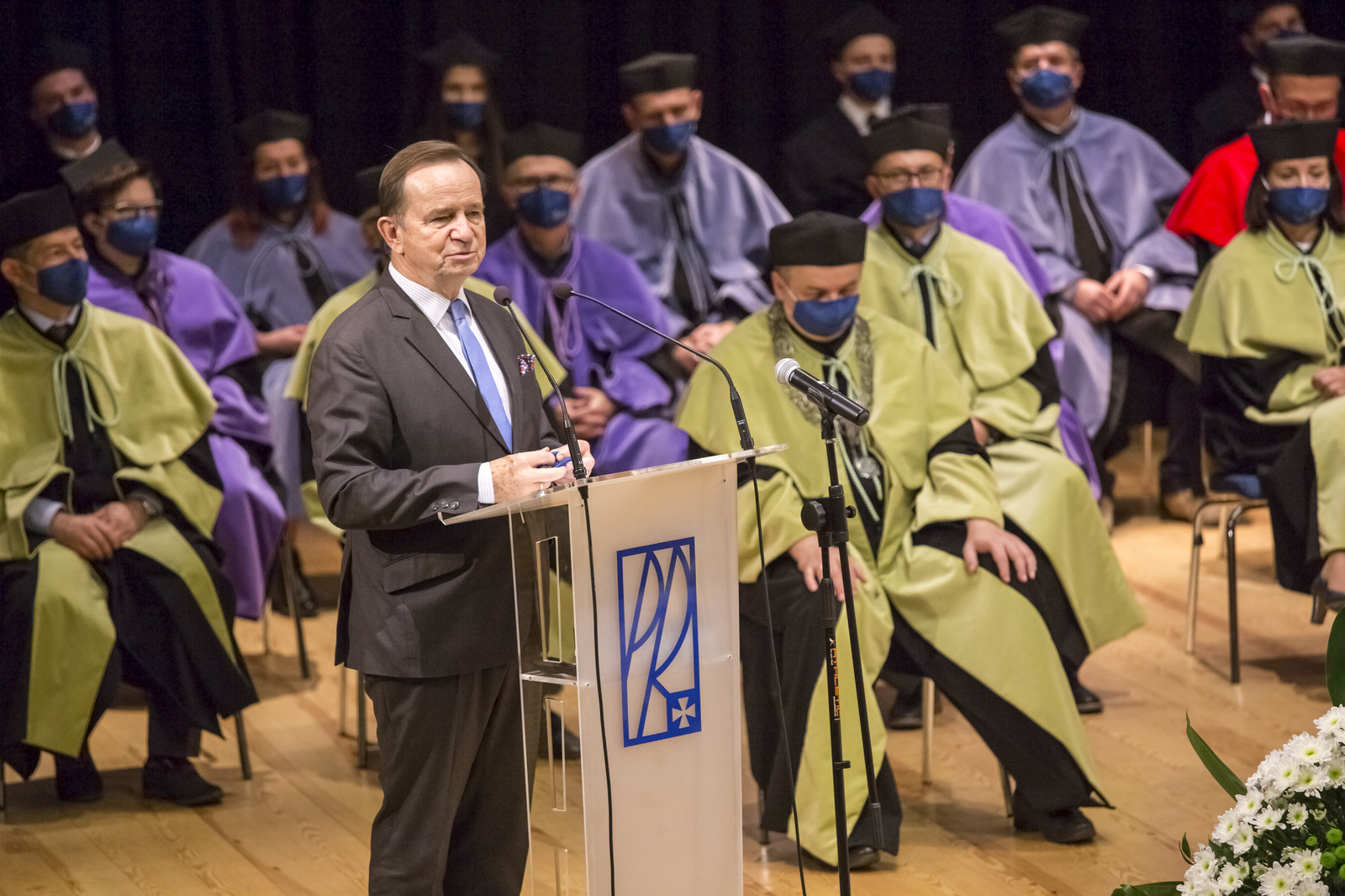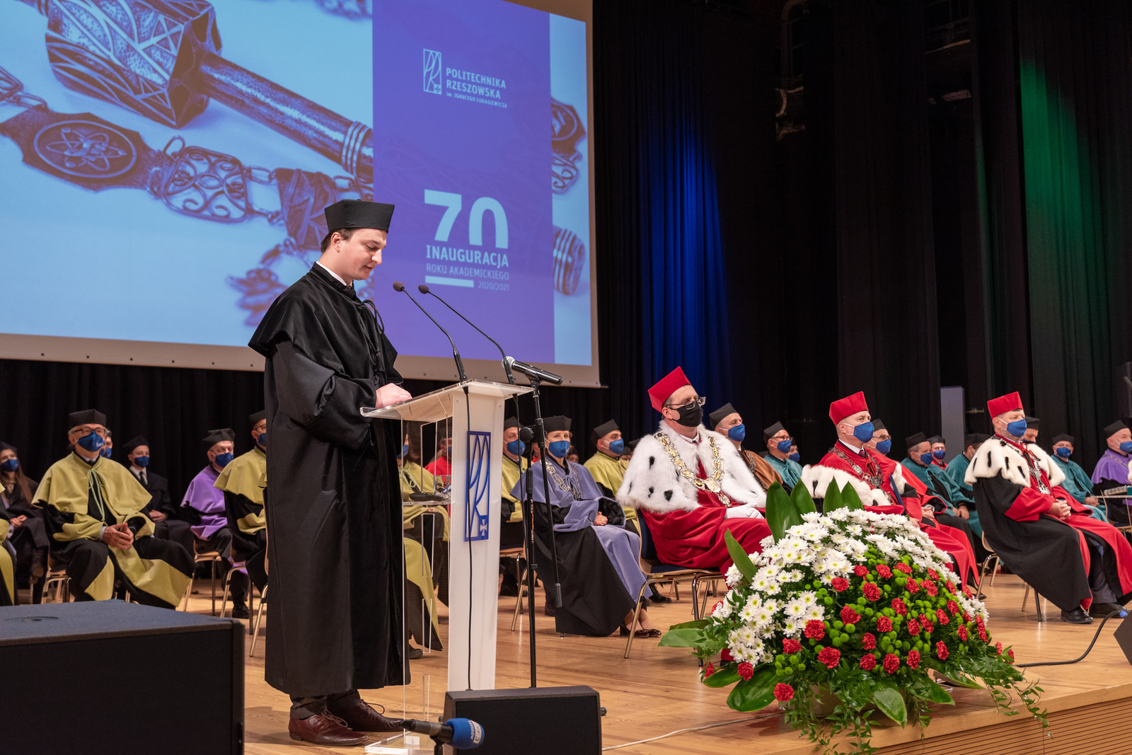 Ze względu na sytuację epidemiczną uroczystość inaugurująca jubileuszowy 70. rok akademicki na naszej uczelni odbyła się w warunkach zaostrzonego reżimu sanitarnego z zachowaniem wszelkich środków ostrożności. Pracownicy, studenci i sympatycy naszej uczelni mogli w niej uczestniczyć w relacji na żywo transmitowanej na kanale YouTube, uczelnianym Facebooku i na antenie Akademickiego Radia i Telewizji Centrum.